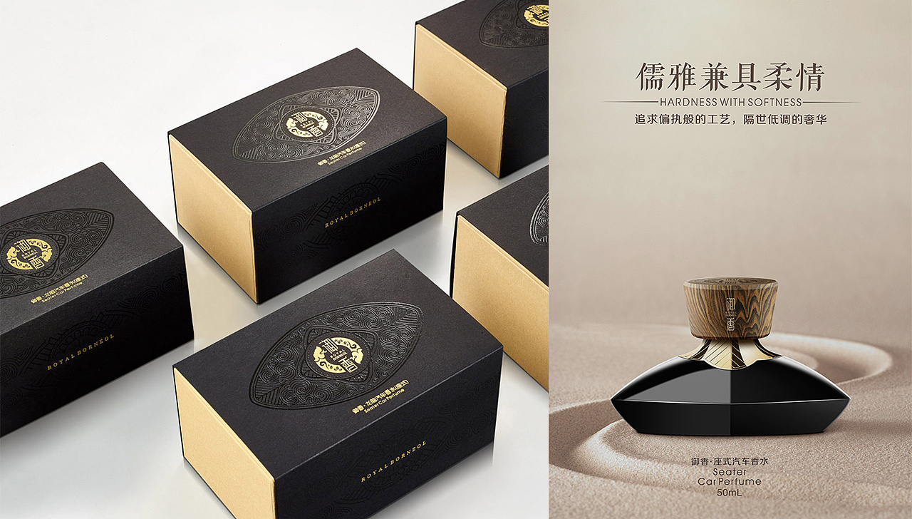此次,汽車香水包裝設(shè)計儒雅兼具柔情,從瓶型的設(shè)計到包裝盒的元素設(shè)計都運(yùn)用龍腦葉子的造型為基礎(chǔ),融入了神秘的東方文化圖騰——祥云、葉子,水源等自然生態(tài)藝術(shù),展現(xiàn)對大自然元素最崇高的致敬。