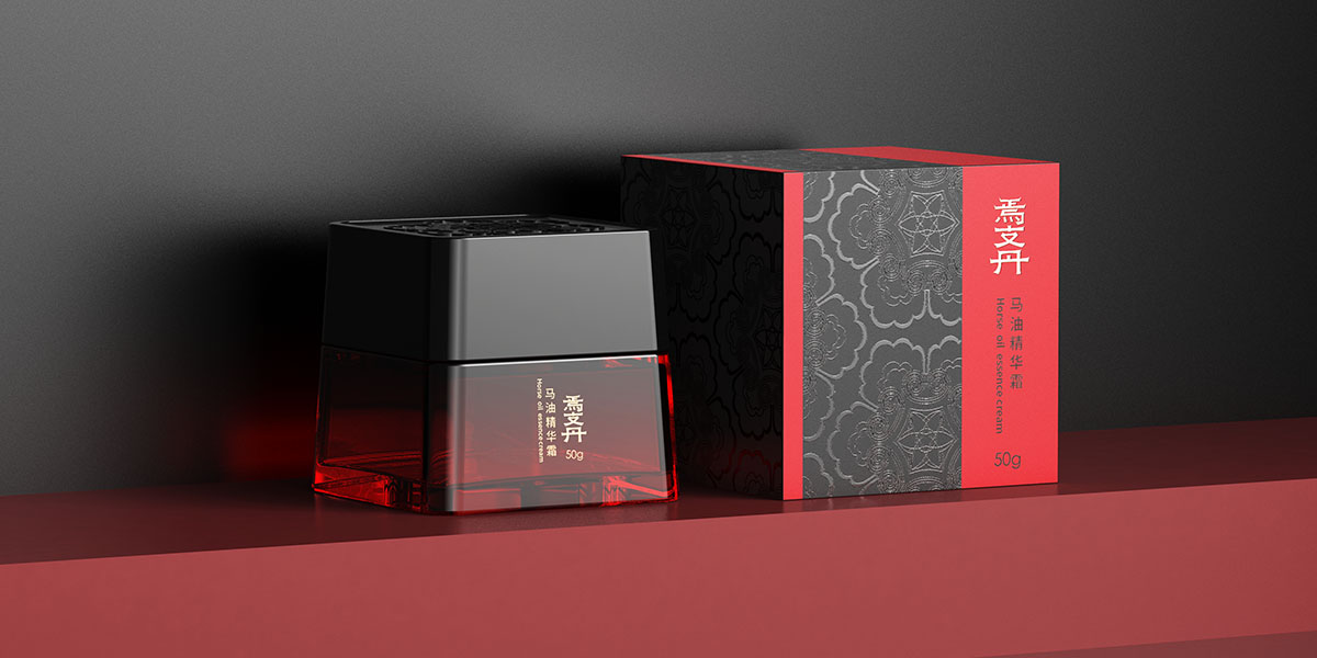 本方案增加兩種不同面霜瓶與包裝設計。左邊采用硬卡天地蓋形式,瓶身采用紅黑漸變,連接黑色瓶蓋,瓶蓋采用寶相花紋刻印,增加細節與層次感。天地蓋硬卡盒版設計增加馬頭燙金墊板,呼應品牌“馬油”印象。采用漆器紅黑配色,打造漢唐視覺效果,體現低調奢華的貴族氣質。