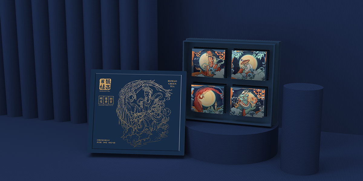 木馬設計將當地傳統品類綠茶作為城市形象的有效傳播載體。以包裝設計為先導,通過藍底金邊的視覺表現方式,打造日照綠茶品牌,突出人文精神與景觀特色,輸出日照城市標簽。弘揚日照城市文化、助力城市旅游經濟發展。
