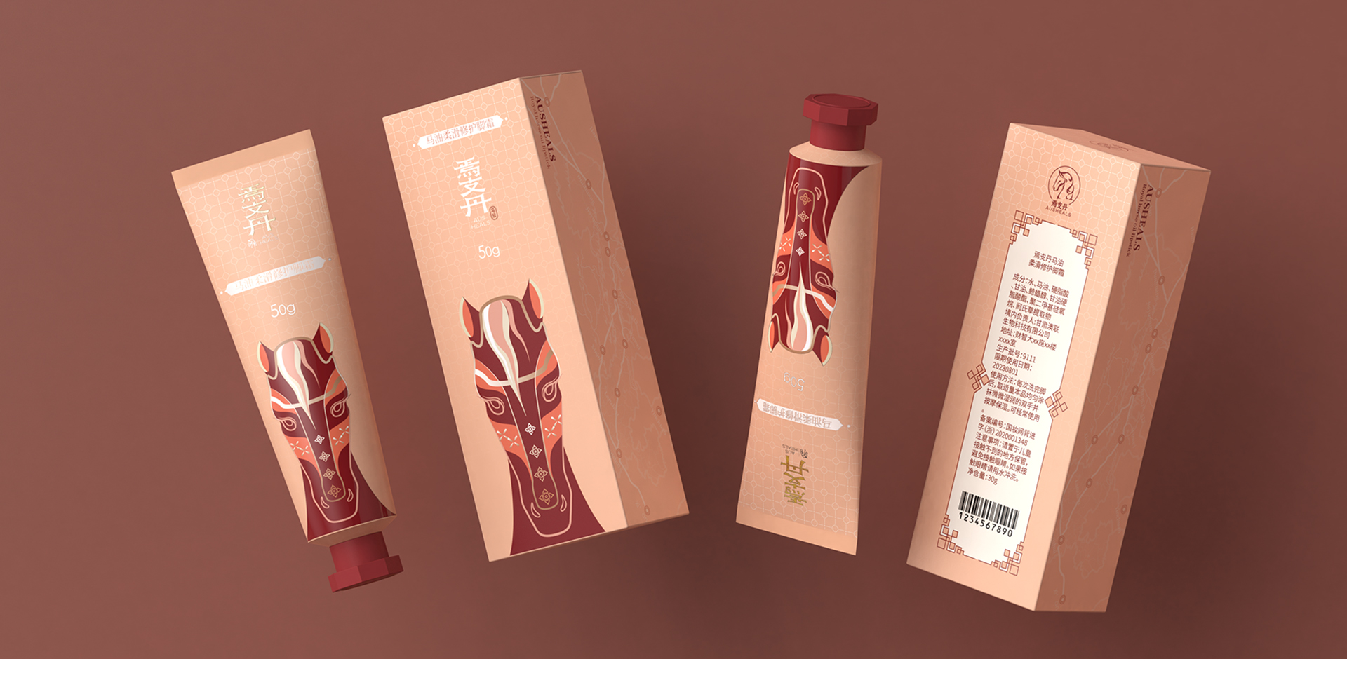 本方案中抓住產(chǎn)品主打成分“馬油”的視覺載體“馬”,將西北地理特征與歷史圖紋融入馬頭設(shè)計(jì)中,豐富產(chǎn)品內(nèi)涵。