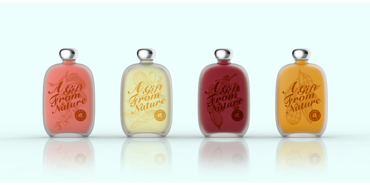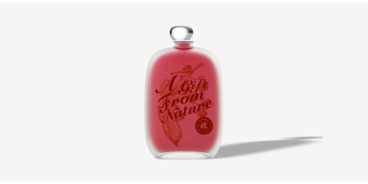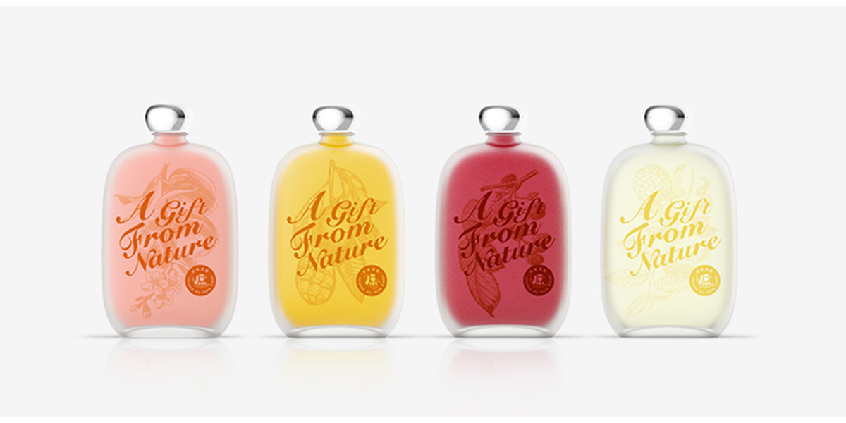 整體包裝設計,以果酒所對應的水果插畫,為背景,表達果酒原料取之于自然,新鮮健康。整體為輕奢暗紋,花體英文古典優雅。藝術性較強的英文花體為視覺焦點,突出品牌slogan-大自然的禮物。品牌logo及簡要產品信息,更易于讓消費者快速了解產品。