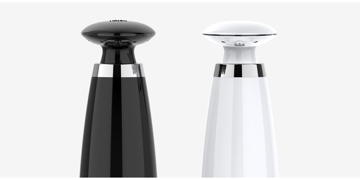臺面感應皂液器采用仿生的設計,將傘狀“蘑菇”形態運用到產品中。產品運用了紅外感應技術,由電機驅動噴頭,自動噴出適量的洗手液到使用者的手心,既省去了使用者按壓出液的動作,也避免多人碰觸而帶來的二次污染,同時出液量可以調節,有效地控制了用量,避免了浪費。