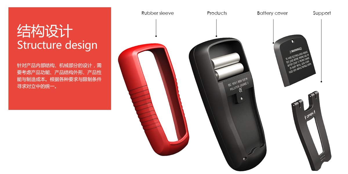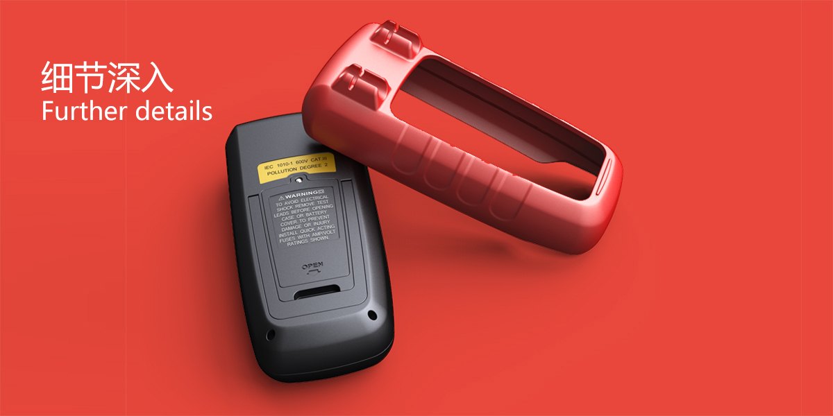 C.A. 萬用表是一款面向歐洲和美國的中低端市場的便攜式檢測設備。西方用戶群體手掌普遍較大,且使用該產品需佩戴絕緣手套,因而產品的按鍵和旋鈕撥盤做出了適當的擴大化處理。旋鈕撥盤為嵌入式設計,確保將表翻轉朝下水平放置在桌面上時,旋鈕臺面不接觸,有效減少磨損