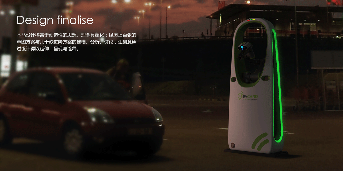 此款自動(dòng)充電樁設(shè)計(jì)致力于簡化電動(dòng)汽車的充電過程,給用戶帶來更便捷、更安全的操作體驗(yàn)。產(chǎn)品運(yùn)用了大面積的鏤空環(huán)繞造型,整體風(fēng)格更具親和力、綠色和科技感,在有效保護(hù)機(jī)械臂的同時(shí),保證產(chǎn)品視覺上的完整性,充分展現(xiàn)了 EVCARD 的產(chǎn)品形象。