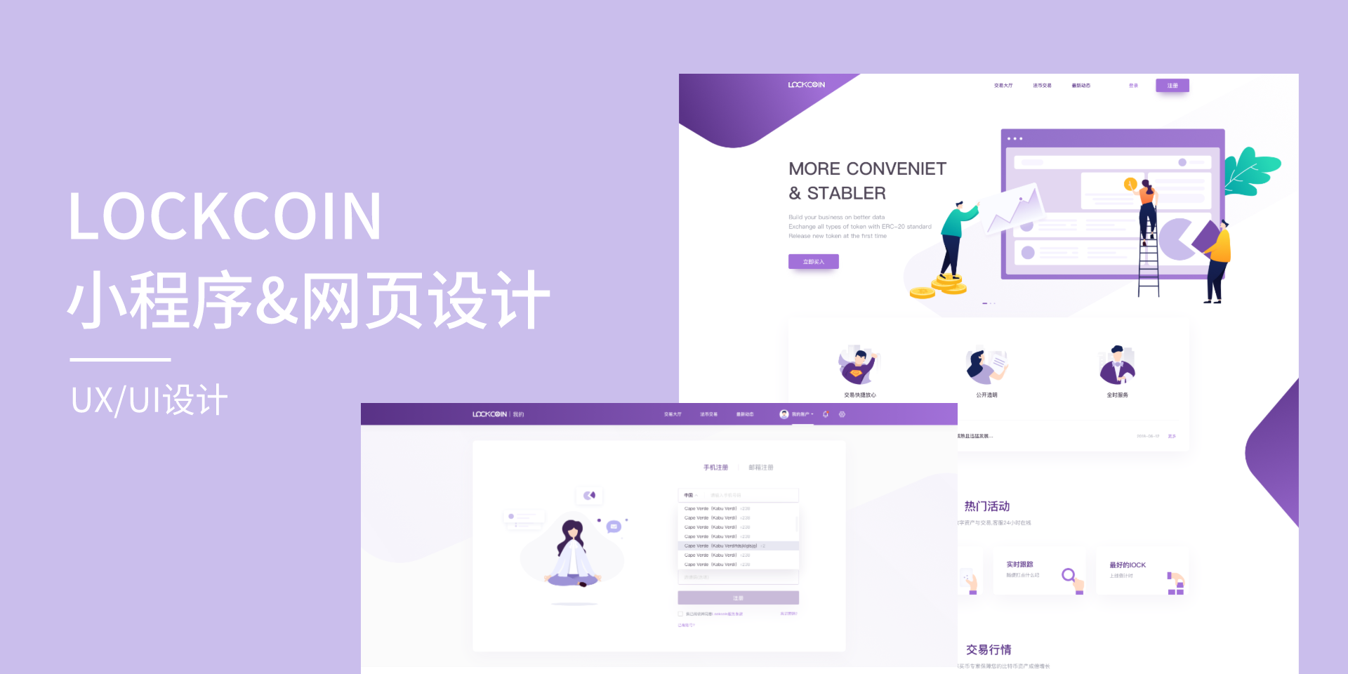 LOCKCOIN小程序及網頁設計緊扣區塊鏈產品目標用戶對幣交易靈活周轉、錢包安全、掌握市場行情變化的心理訴求,通過對競品的大量調查和分析,圍繞定位、人群、功能等多種因素尋找符合產品調性的視覺設計方案。整體界面設計以紫色為主色調,以扁平插畫與幾何圖表相結合的形式…