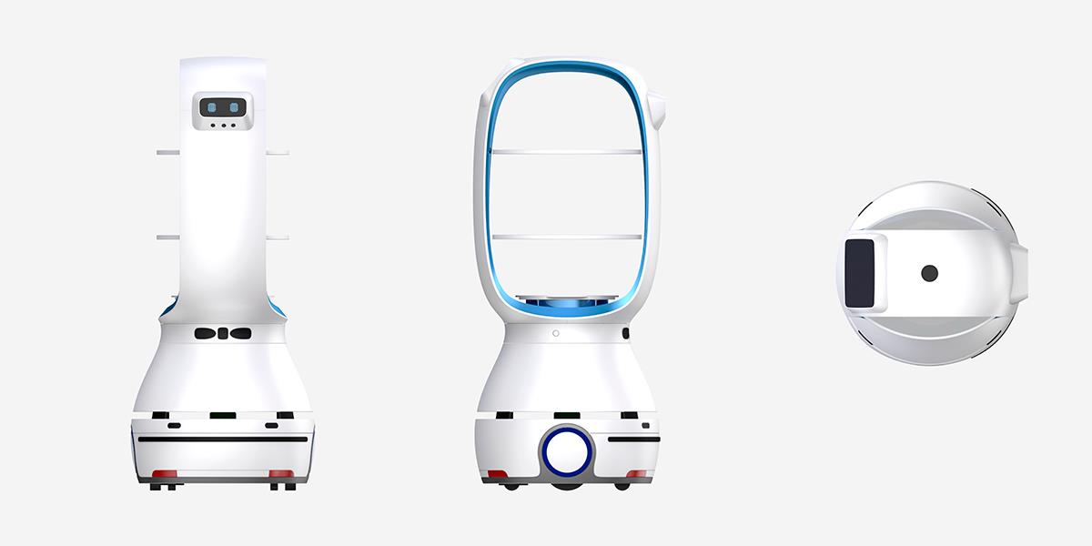 為了滿足品牌形象的統一化,采用共用底盤形式,共用一套導航系統。底盤代表機器人的整個導航算法,上部設計要小于底盤面積,以此來計算行走路線。每個品牌設計大概五六臺不同的上部設備,有的送餐,有的送快遞。