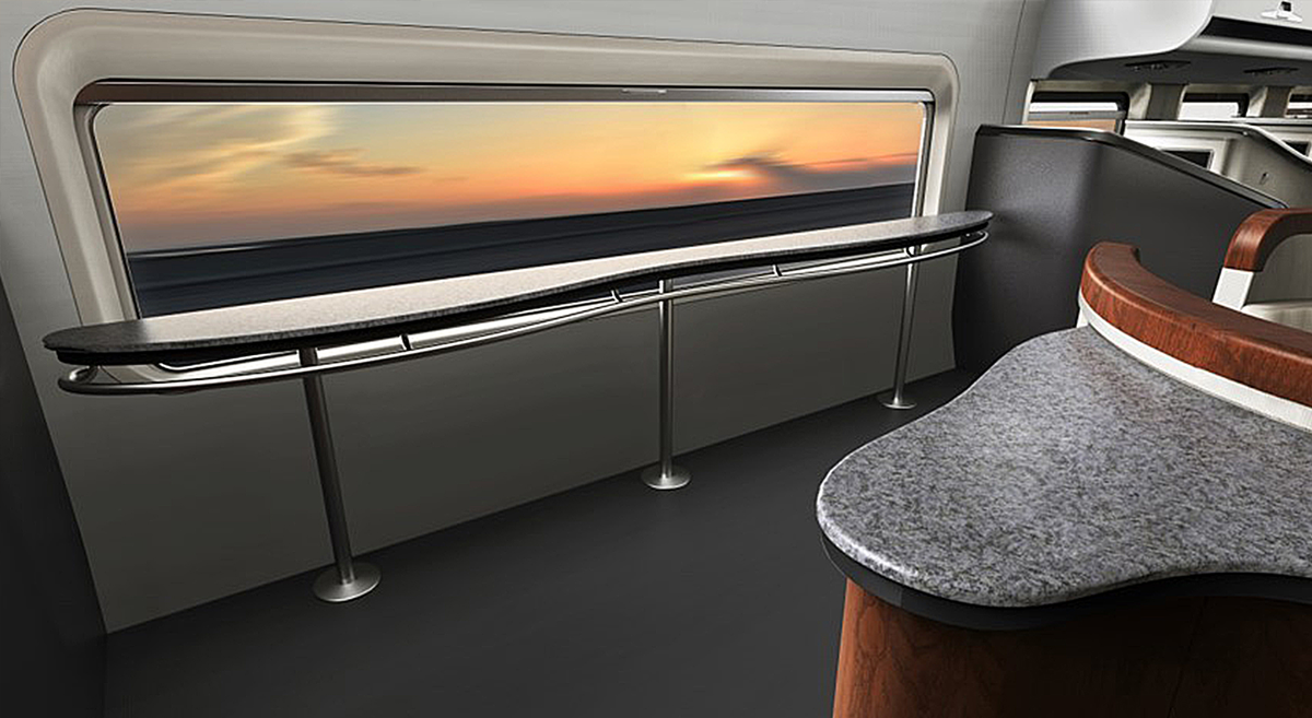 每個位置都有對應的大玻璃窗,可以方便的欣賞到窗外的景色,加之車廂內的燈光效果,渲染浪漫星空,讓每次出行氛圍都成為一種享受! 新設計按乘坐、用餐、乘務、洗手間、行李存放的功能劃分為5個區域,每個區域都配備了完整的功能設施。