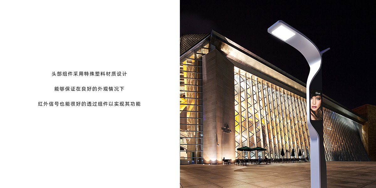 普羅娜完成了一套完整的智慧路燈系統(tǒng),最大的特點(diǎn)是采用了一個(gè)模塊化的創(chuàng)意。頂上有太陽(yáng)能屏、太陽(yáng)能電池,然后用了LED節(jié)能的照明,上面的還有廣告屏以及交互屏,在身體上面還裝了一個(gè)攝像頭,是一套完整的城市監(jiān)控系統(tǒng),形成了一個(gè)這樣的一個(gè)模塊。