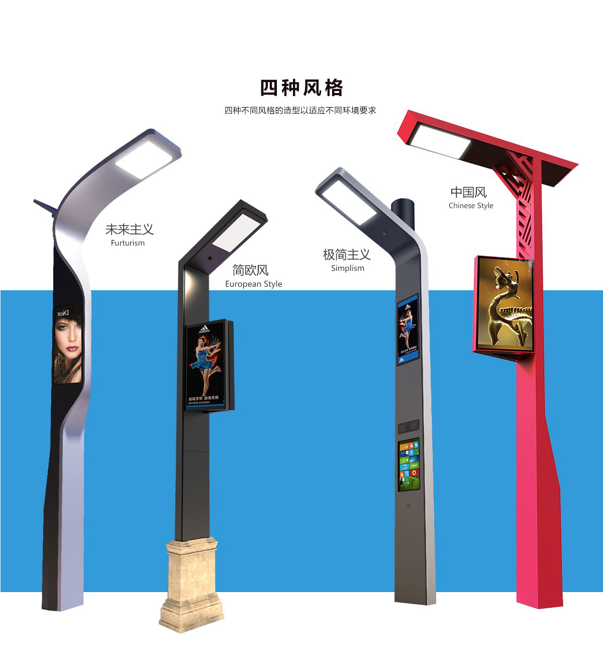 造型上,當(dāng)時(shí)有四款產(chǎn)品。一款的是針對(duì)商業(yè)區(qū)所設(shè)計(jì)的,非常簡(jiǎn)潔,而且視覺(jué)上很有數(shù)碼感的造型;另外一個(gè)是很有中國(guó)風(fēng)的造型,適合比較古樸的地方;第三個(gè)是太空風(fēng)格的具有科幻色彩的形象;第四個(gè)是屬于歐洲歐式風(fēng)格的形象。