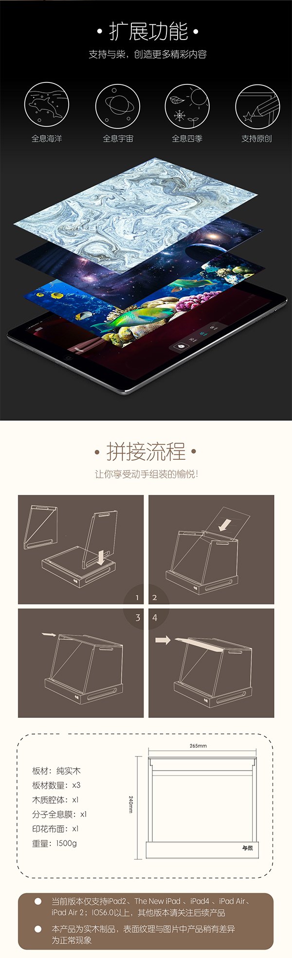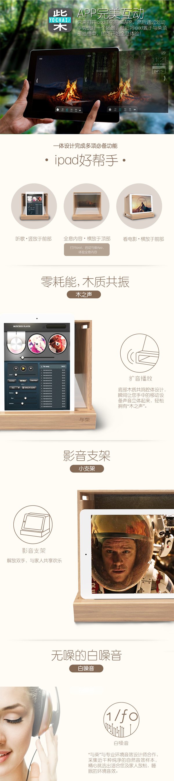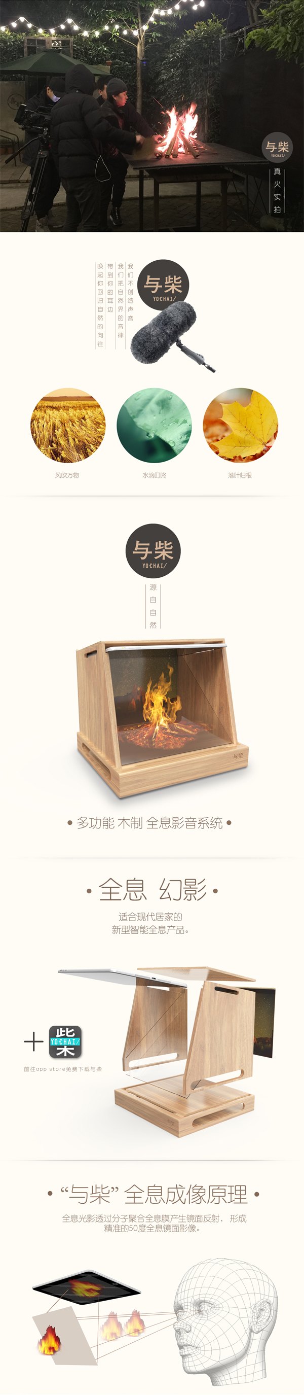 純木質手作的多功能全息影音系統,與ipad結合使用、拓展ipad更多功能。全息智能產品取名“與柴”, 寓意“與柴桑樵牧“,以科技傳承匠心精神。