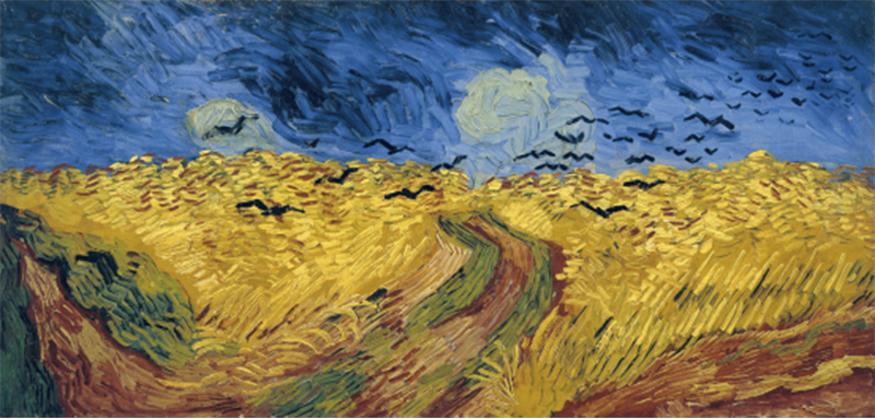 1890年7月27日梵高在麥田中開槍自殺。被槍聲驚起撲楞著翅膀遠去的黑翅膀,就是他幾天畫《麥田群鴉》時見過的那群黑壓壓的鴉群。