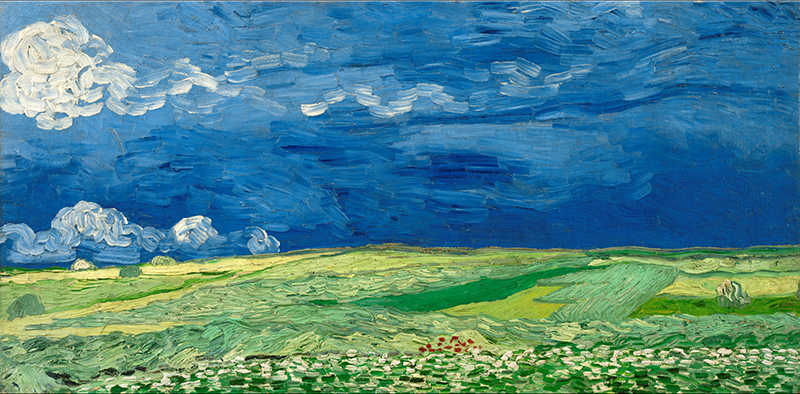 “我將平躺于雷雨下的麥田”,畫中沒有一只鳥,也沒有一棵樹,更沒有一個人。此刻的麥田對于梵高來說,竟有幾分李白眼中敬亭山的意趣。“眾鳥高飛盡,孤云獨去閑。相看兩不厭,只有敬亭山。”用唐詩來詮釋一幅油畫,讓人有些混搭的新奇,就好像當我們看見用油畫來詮釋現代生活元素一樣。