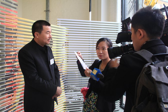 丁偉在場外接受記者的采訪