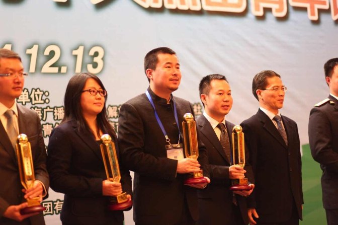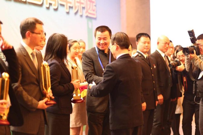 丁偉從全國政協(xié)常委、上海市政協(xié)副主席周漢民領(lǐng)導(dǎo)手中接過這意義深刻的獎杯