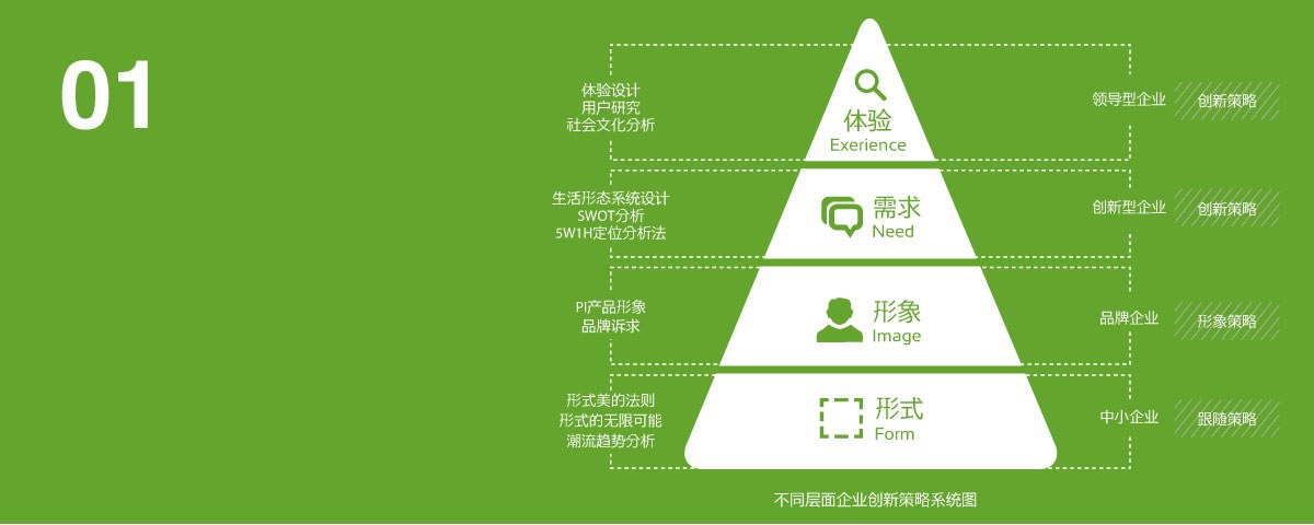 中國的制造企業現狀是多層次的,既有外向型加工型企業,又有品牌企業和高科技企業,工業設計要為多層次的產業服務,需要構建多層次的服務系統,以滿足多樣化的創新需求。 不同發展階段的企業對于工業設計的認識和需求是不一的。對于技術導向型企業而言,設計僅僅是體現產品技術的手段;對于需求導向型企業而言,設計需要挖掘市場和用戶的 潛在需要。創新型企業和跟隨策略型企業在市場競爭面前也會選擇不同的設計方法。通過對企業需求類型進分類,并找到相應的設計方法,可以解決企業設計有效創新的問題。 “形式”、“形象”、“需求”、“體驗”是設計由淺入深的四個階段,不同層面的企業會對應不同的重點。