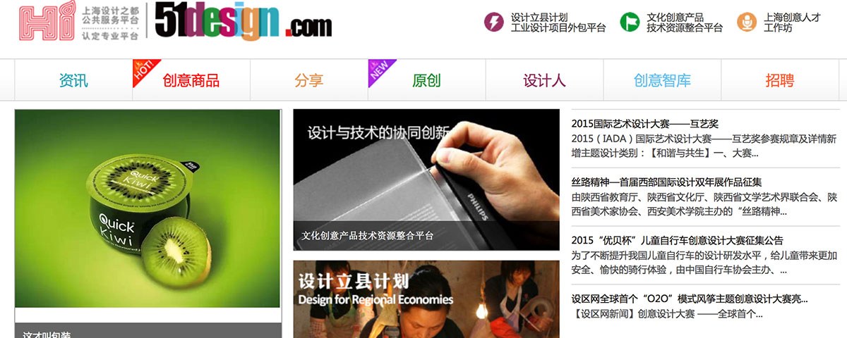 51design,創意與設計的門戶網站之一。它是設計師的思想源泉、創意智庫,是原創作品和設計師交流分析的平臺;它致力于成為創意領域的行業門戶網站和中文創意與設計門戶網站。從設計立縣,創意資本中心,到用戶調研中心、品牌設計研究中心和產品中試平臺、產品展示旗艦店,51design不斷開發更加實用的專業功能模塊,為用戶提供高質量的服務,并依托強有力的資源,為創意人才打造一個更高效、更便捷的產業服務家園。