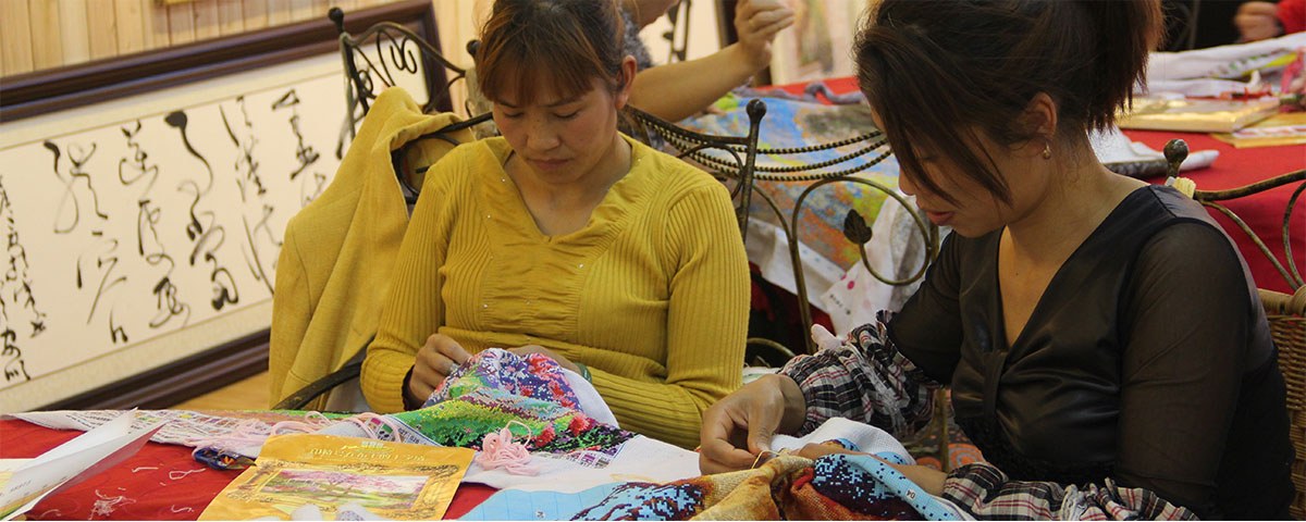 寶應縣的亂針繡工藝細膩,表現手法豐富多樣。然而長期以來題材以臨摹油畫為主,且以委托加工的方式居多,制約亂針繡發展最重要的困境在于知識產權問題。設計立縣計劃團隊赴寶應進行實地考察,提出打造“藝術授權產品“的創新策略,將上海創意產業園中的優秀畫家所創作的作品進行授權,創作成亂針繡作品。同時針對全手工的亂針繡,我們提出通過導入新技術來提升生產效率,讓亂針繡前期”打樣“用機器繡,后期再加入手工繡。這種方式降低了生產成本,通過技術嫁接后,能將亂針繡打造適合現代家居生活的用品,為亂針繡拓寬了低端市場,滿足用戶的需求。