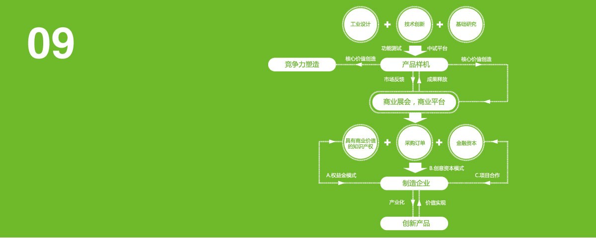 創意資本模式是創意設計價值實現的高級階段,將創意的力量作為一種資本形式驅動制造企業 的發展。從概念設計到產品樣機再到具有知識產權的創意資本,創意的價值得以真正實現。 基于特色產業,建立區域工業設計研究院,不斷釋放效果。從概念設計,到產品樣機,再到具有知識產權的成果,幫助企業實現從制造力驅動到創新力驅動的轉變。搭建知識產權展示和交易平臺,更好的把產業需求和創意資源對接。建立知識產權保護平臺,保障創意資本模式的正常運行。