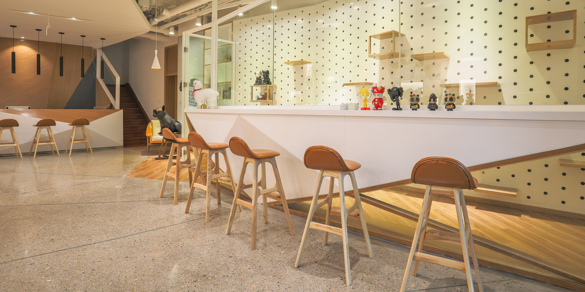 設計整體采用暖色調,木地板與地磚混搭,并用寵物玩偶擺件進行藝術點綴,在設計之初充分考慮寵物習性和人方便需求,層次豐富,打造人與寵物和諧共處的生活空間。