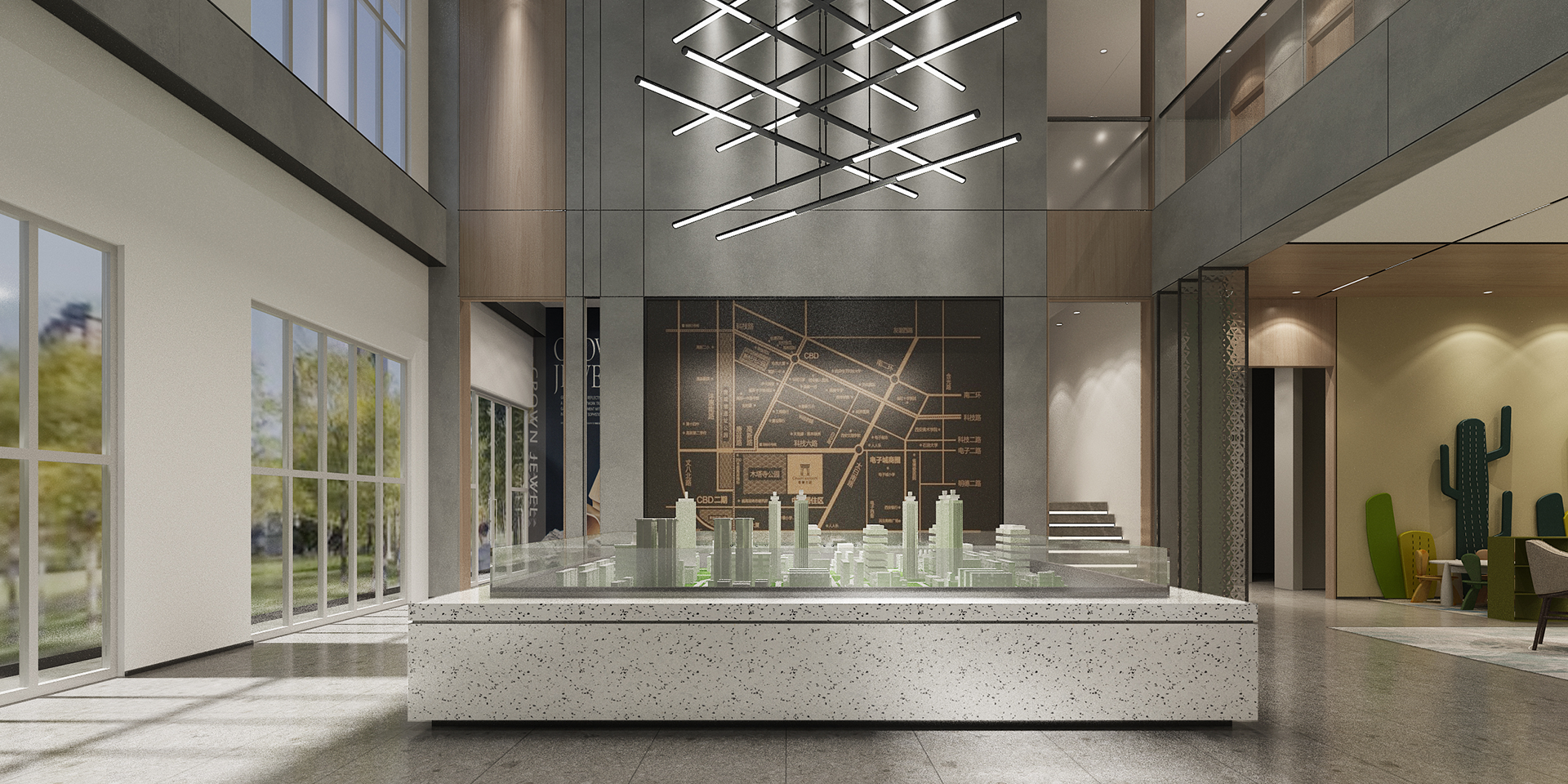 作為樓盤的營銷中心,本案的設計融合樓盤品牌理念,前臺接待區拋棄繁雜裝飾,僅以LOGO裝飾,簡約不簡單。沙盤區與洽談區兩區相互開放,功能涇渭分明,呼應空間的整體氣質,設計師選擇現代簡約座椅,色調風格與整體暖色設計呼應,流動的燈光和點點亮色綴給整體空間帶來生動…