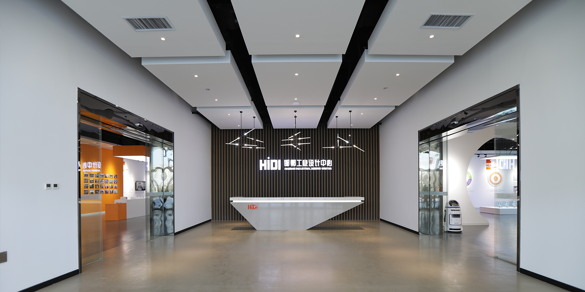 中心一層為展示大廳與眾創(chuàng)空間。展廳在充分考慮參觀動(dòng)線的基礎(chǔ)上采用圖片、文字、展品、多媒體多種手段進(jìn)行方位展示,通過(guò)企業(yè)聯(lián)盟、發(fā)展大事記、獲獎(jiǎng)?wù)故尽a(chǎn)業(yè)類(lèi)型、服務(wù)模塊、工業(yè)發(fā)展歷程等內(nèi)容介紹。徐徐揭開(kāi)了中心的神秘面紗對(duì)于辦公空間的氛圍追求。