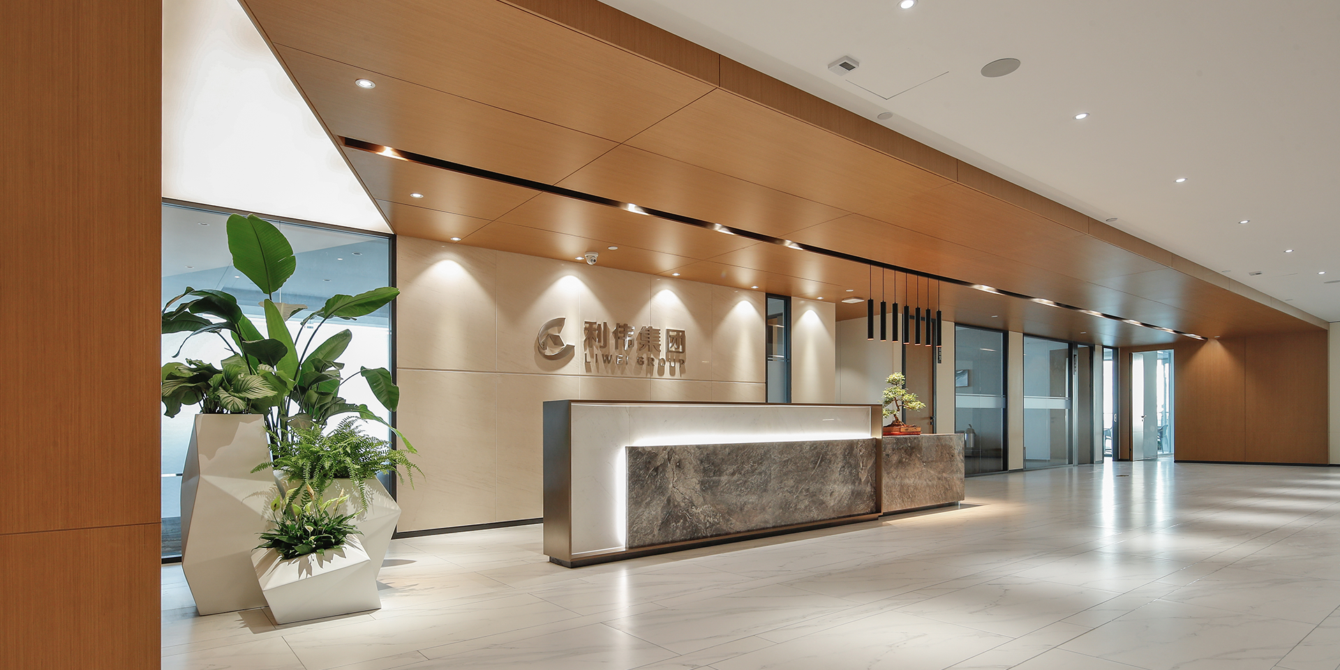 本案造型設計流暢,大量的應用線條,用綠色植物裝飾每個角落,接待室設計采用多風格融合,尊重自然,追求效率,展現出公司的冷靜和務實。